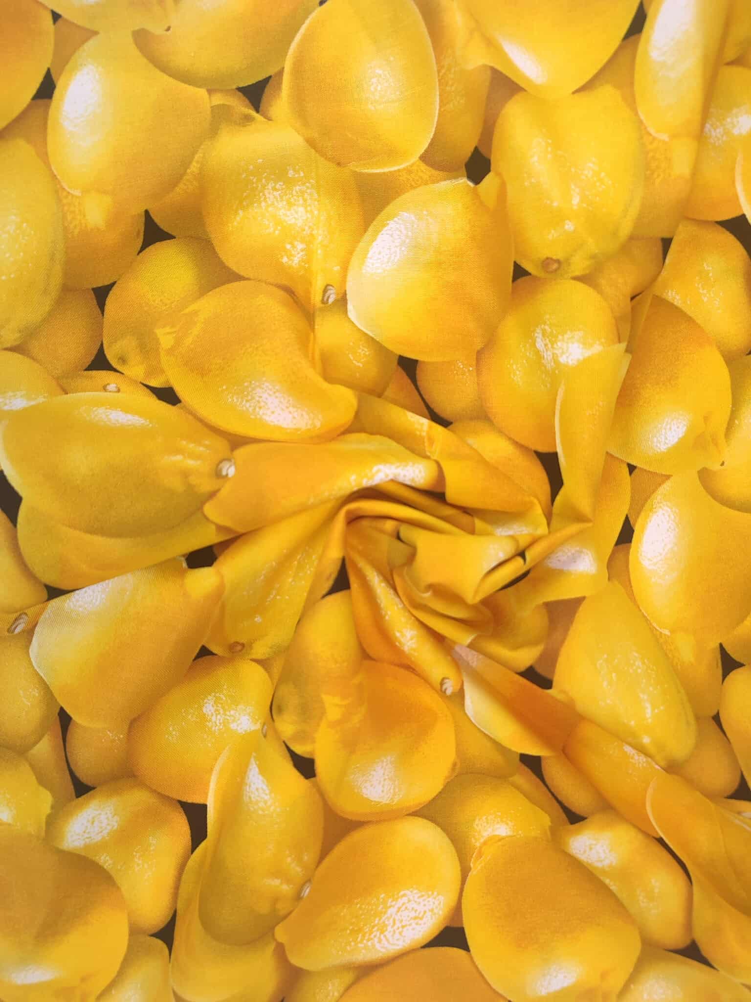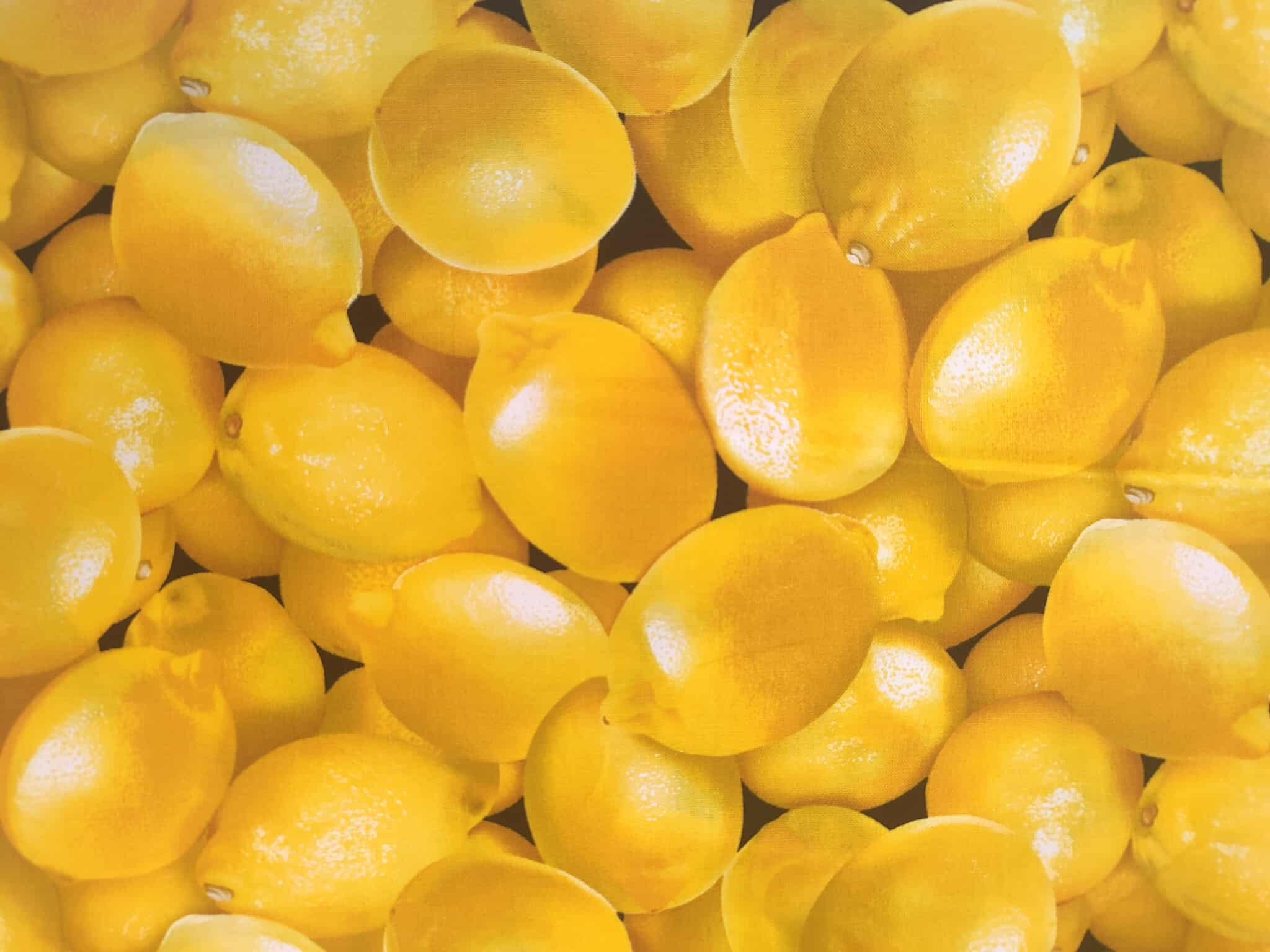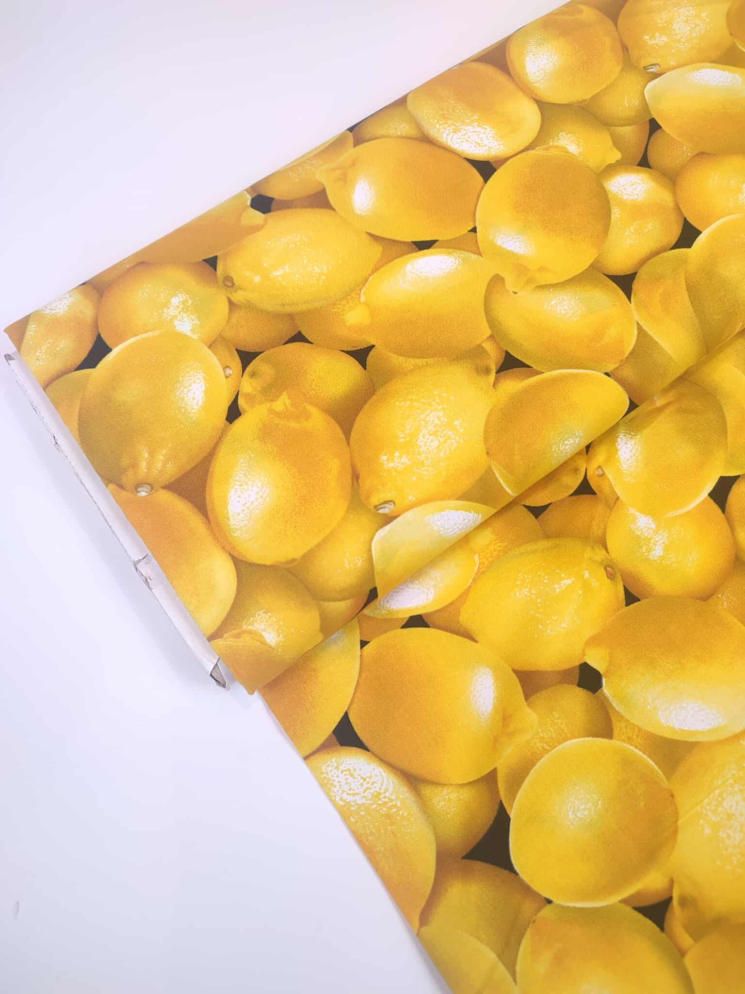 Mooie, bedrukte katoen met citroenenprint in verschillende tinten geel van het merk Timeless Treasures. Perfect voor het maken van kussens, kinderkleding, decoratie, …