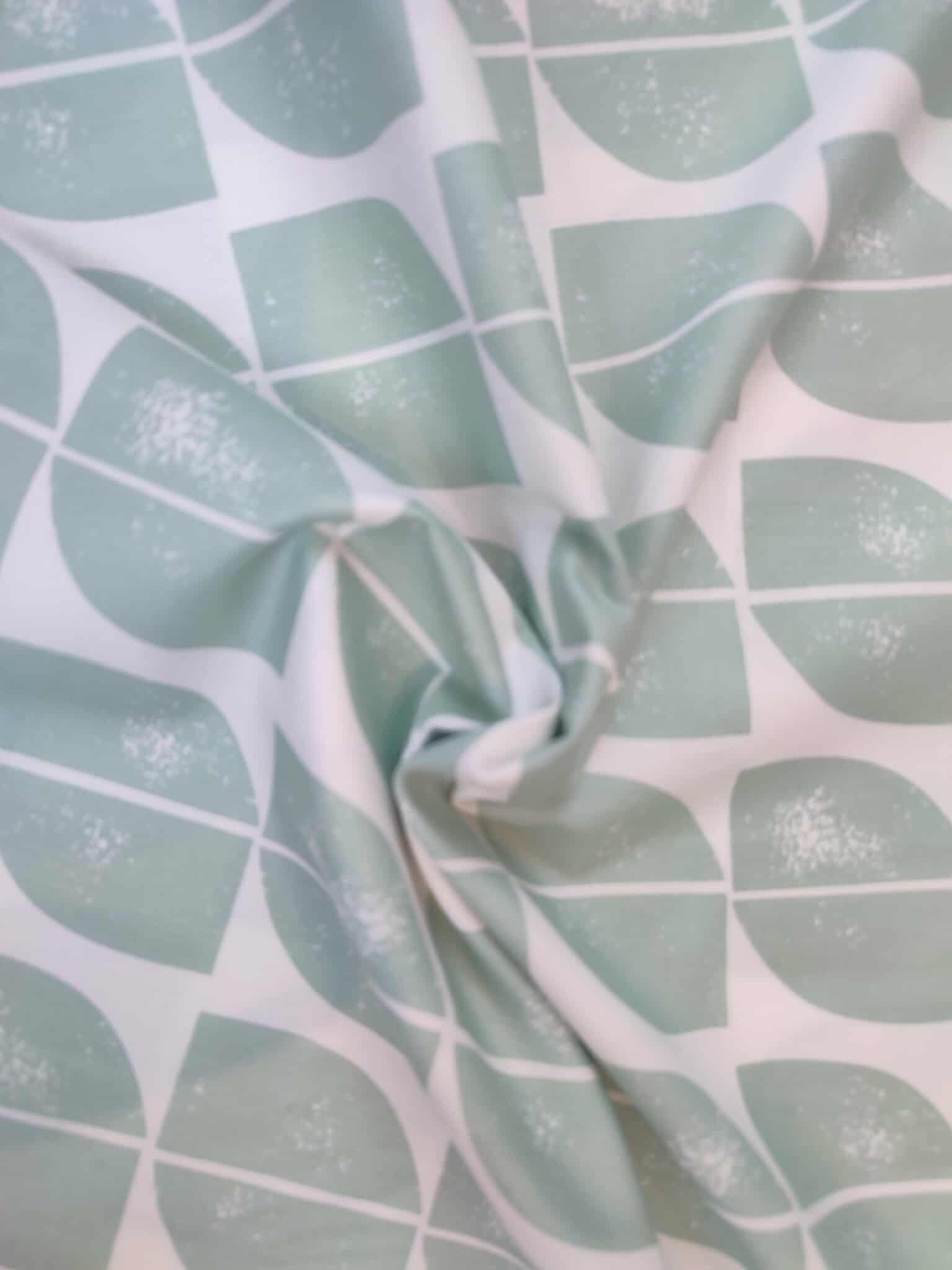 Mooie, bedrukte katoen met geometrische bladerenprint in muntgroen op een witte achtergrond van het merk Windham Fabrics. Perfect voor het maken van kussens, kinderkleding, decoratie, …