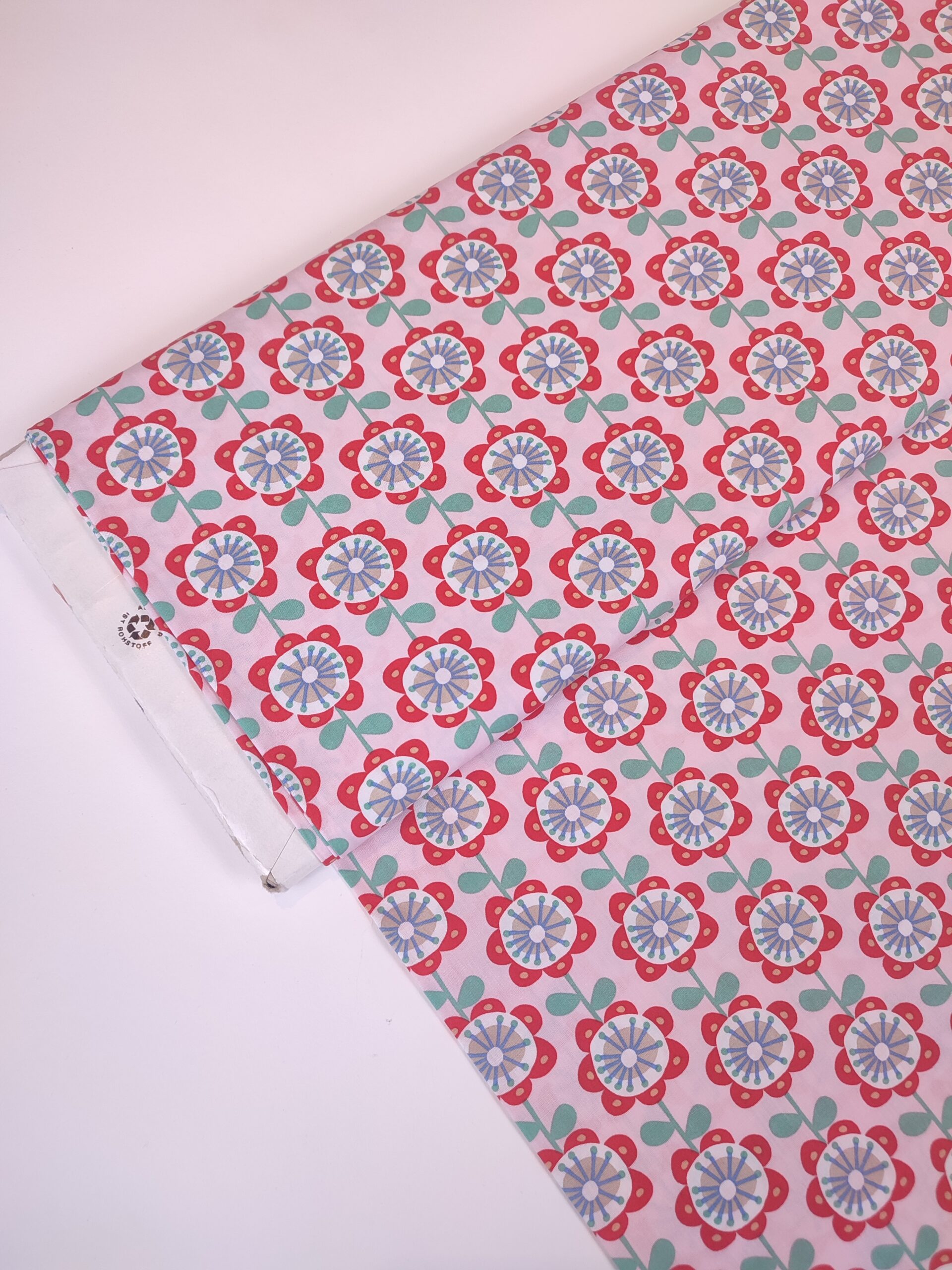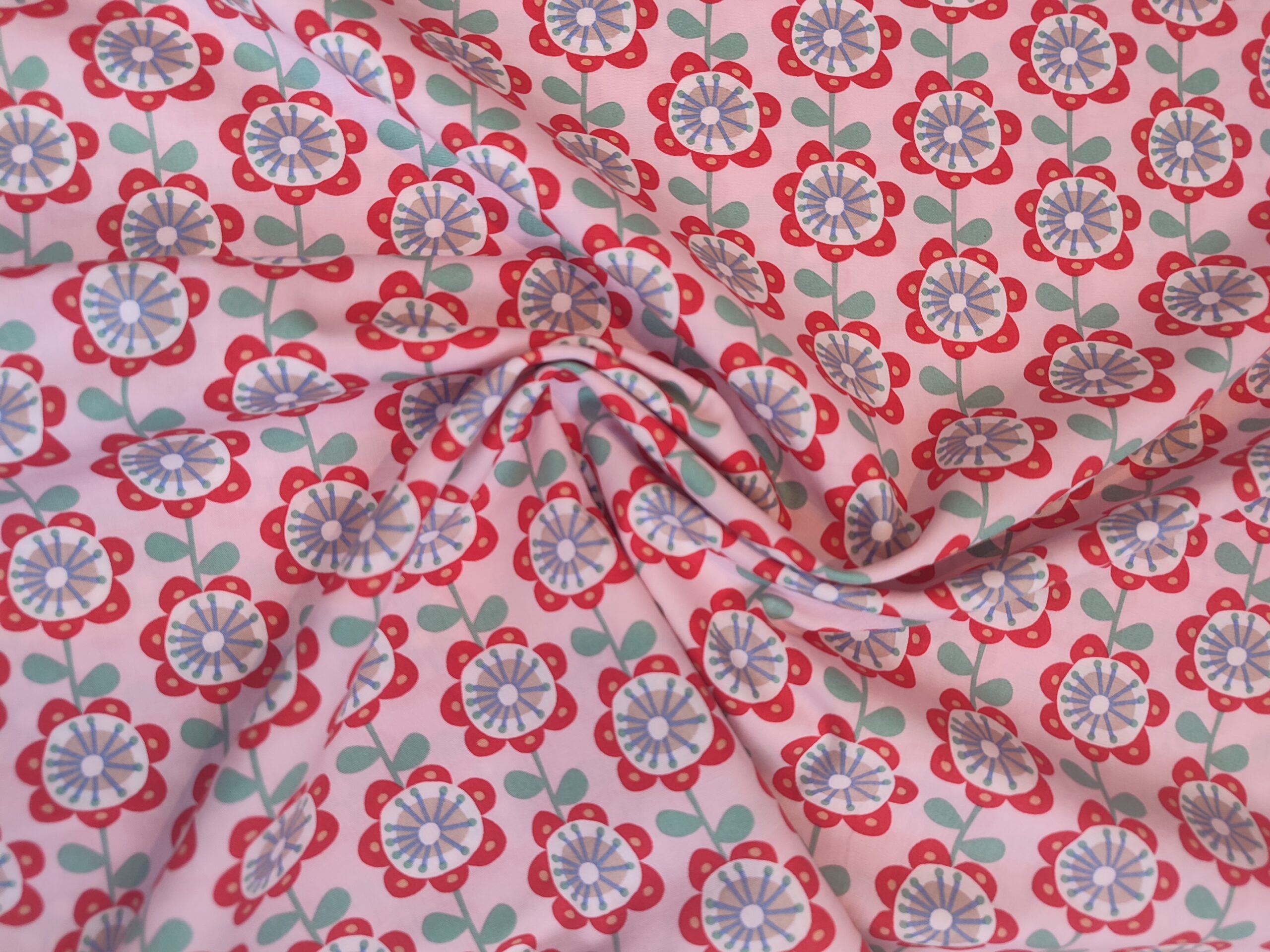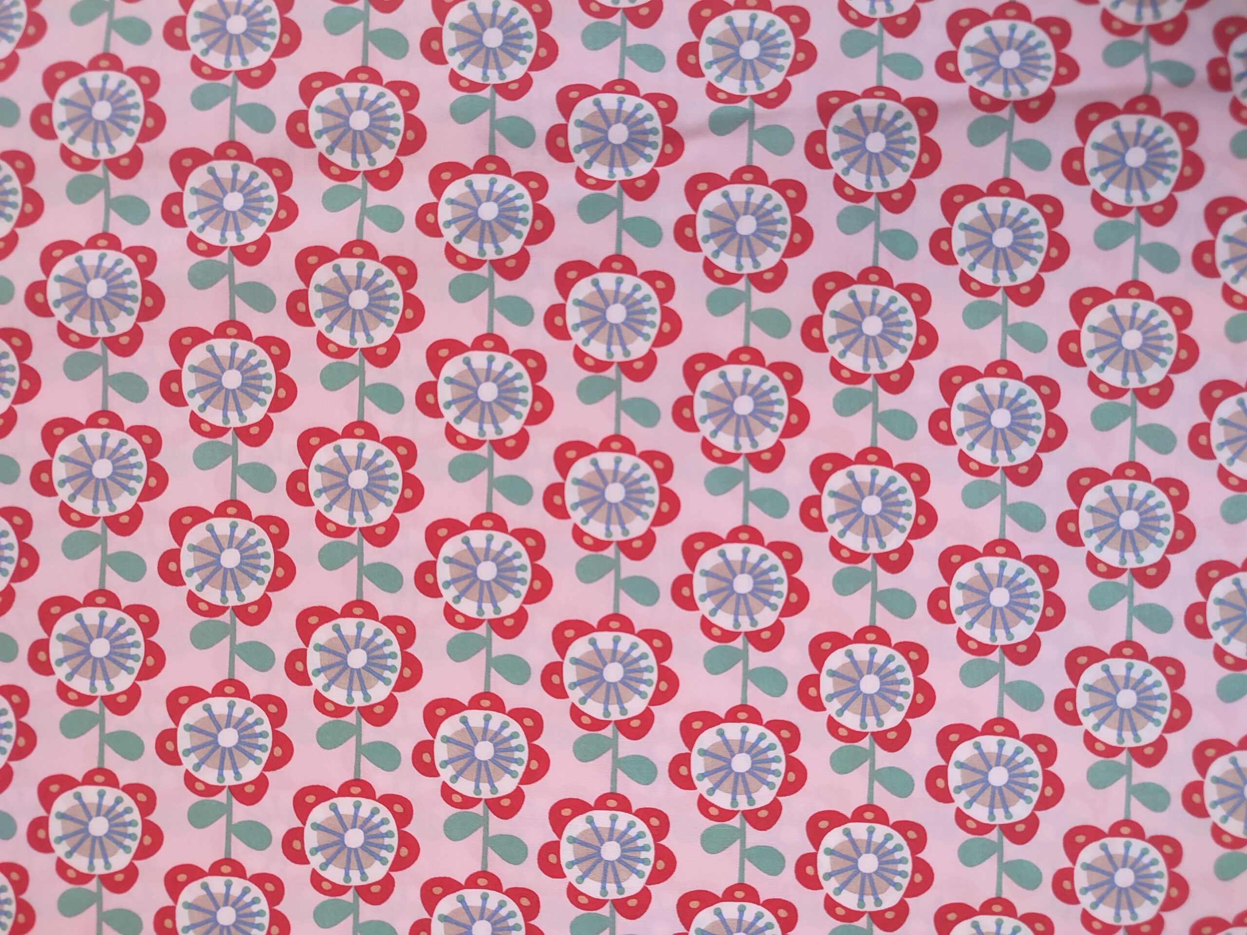 Mooie, bedrukte katoen met retro bloemenprint in rode, mingroene, blauwe, grijze en lichtoranje tinten op een lichtroze achtergrond. Perfect voor het maken van kussens, kinderkleding, decoratie, …